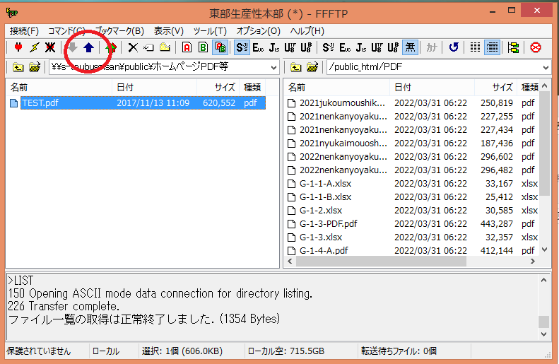 - 該当ファイル(今回はTEST.pdf)を選択して、赤○の「↑」を押してください。該当ファイルがレンタルサーバー上の該当フォルダにアップされます。
