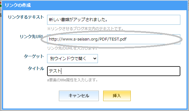 6.書き込んだ記事の書類名を範囲指定し、先程コピーしたアップ先のリンクを〇の場所に張り付けてください。